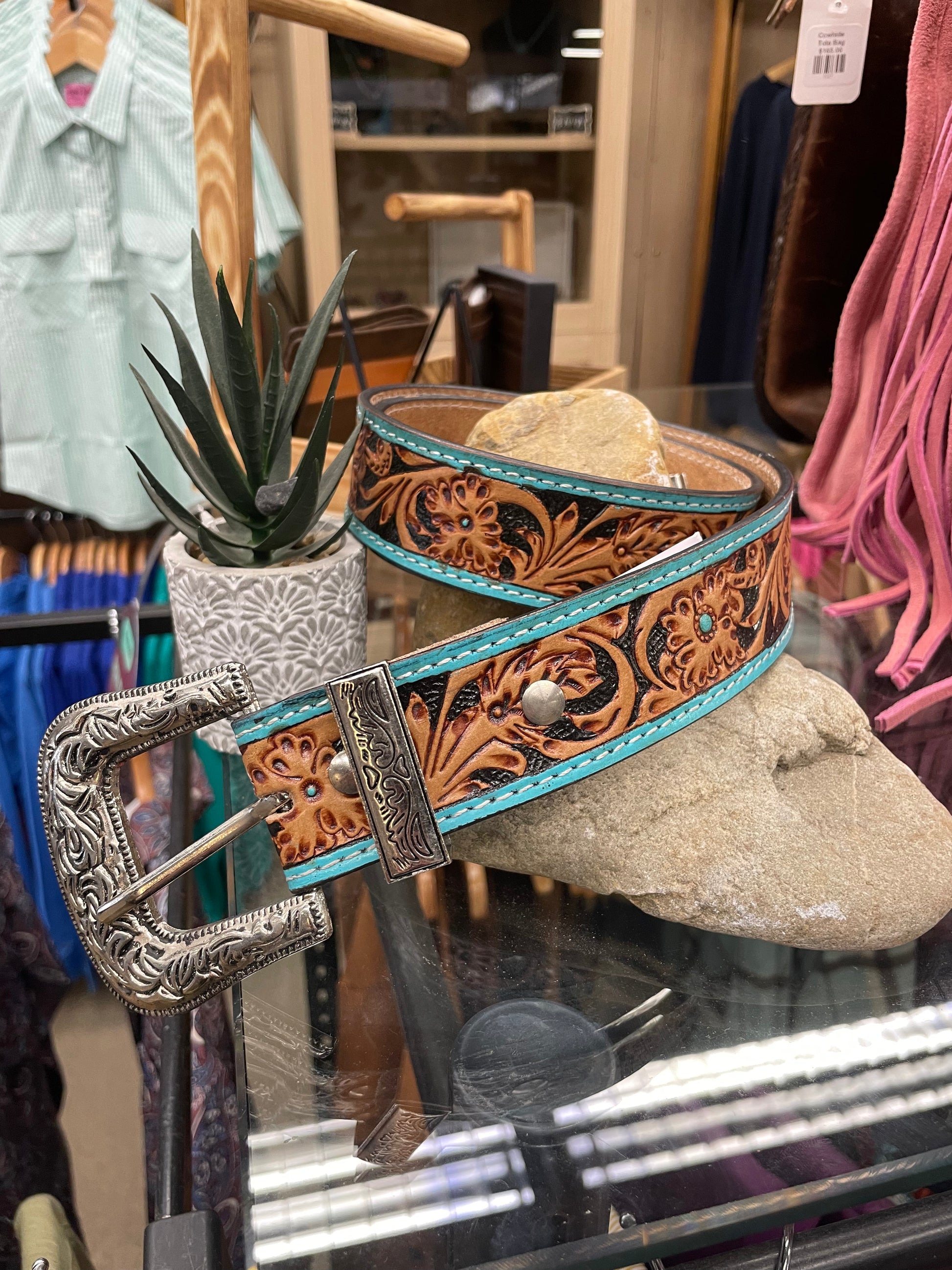 Expertly handcrafted from premium full-grain leather, this belt is built for durability and timeless style. Whether you're dressing up for a rodeo, adding flair to your everyday look, or pairing it with your favorite cowboy boots, the Turquoise Blossom Belt is a statement piece that embodies Western heritage with a refined touch.